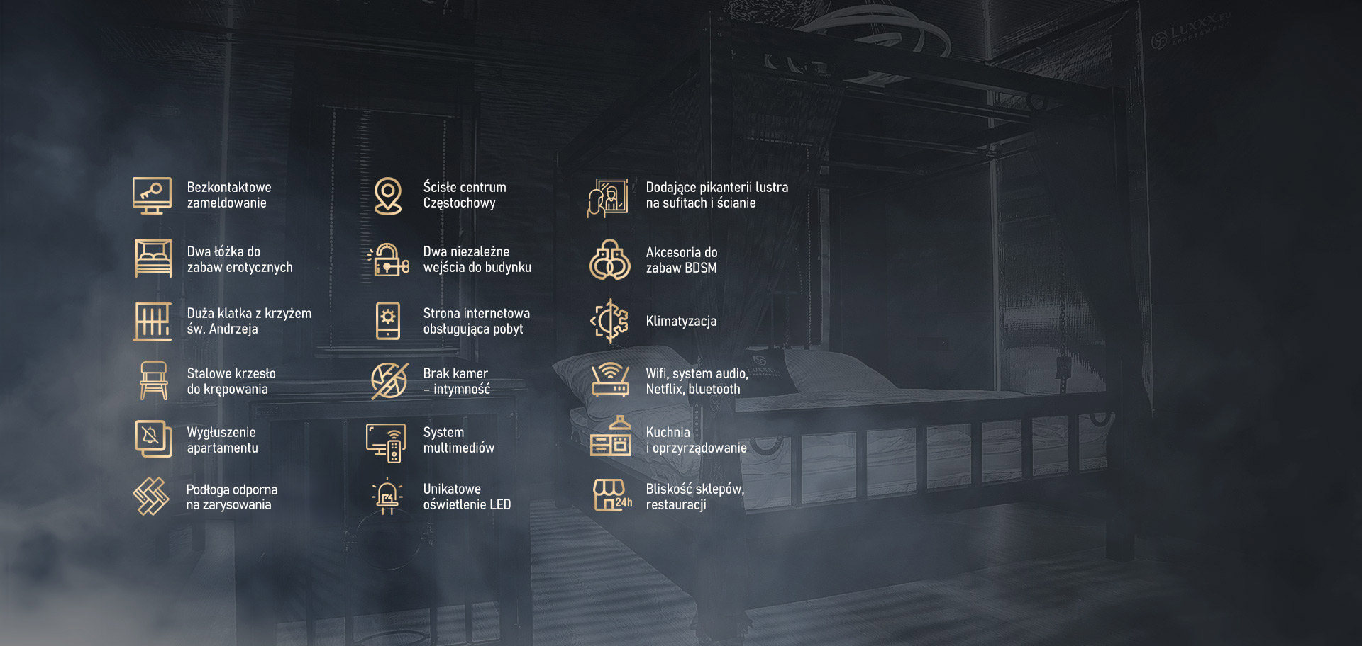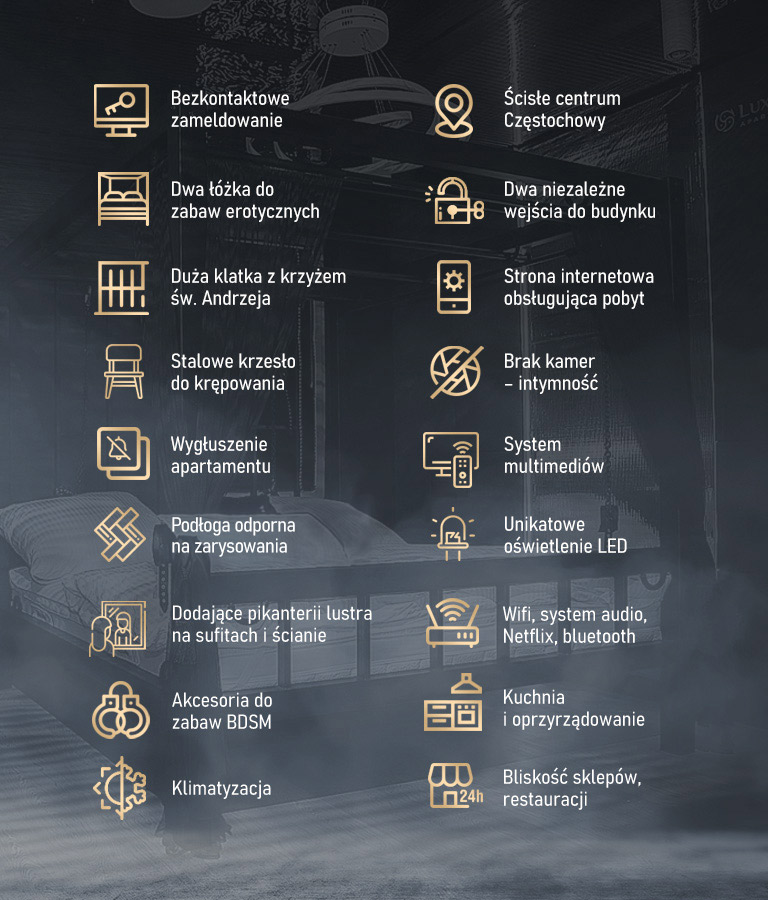 Położony w Częstochowie, w bliskim sąsiedztwie Śląska apartament.luxxx.eu to namiastka tajemnicy, podniecenia, wyjątkowych wrażeń, ciekawości i rozbudzenia w jednym. Jeżeli chcesz oderwać się od codzienności i marzysz o spełnieniu swoich fantazji, ponadto lubisz klimaty BDSM to apartament jest miejscem dla Ciebie i dla Was!