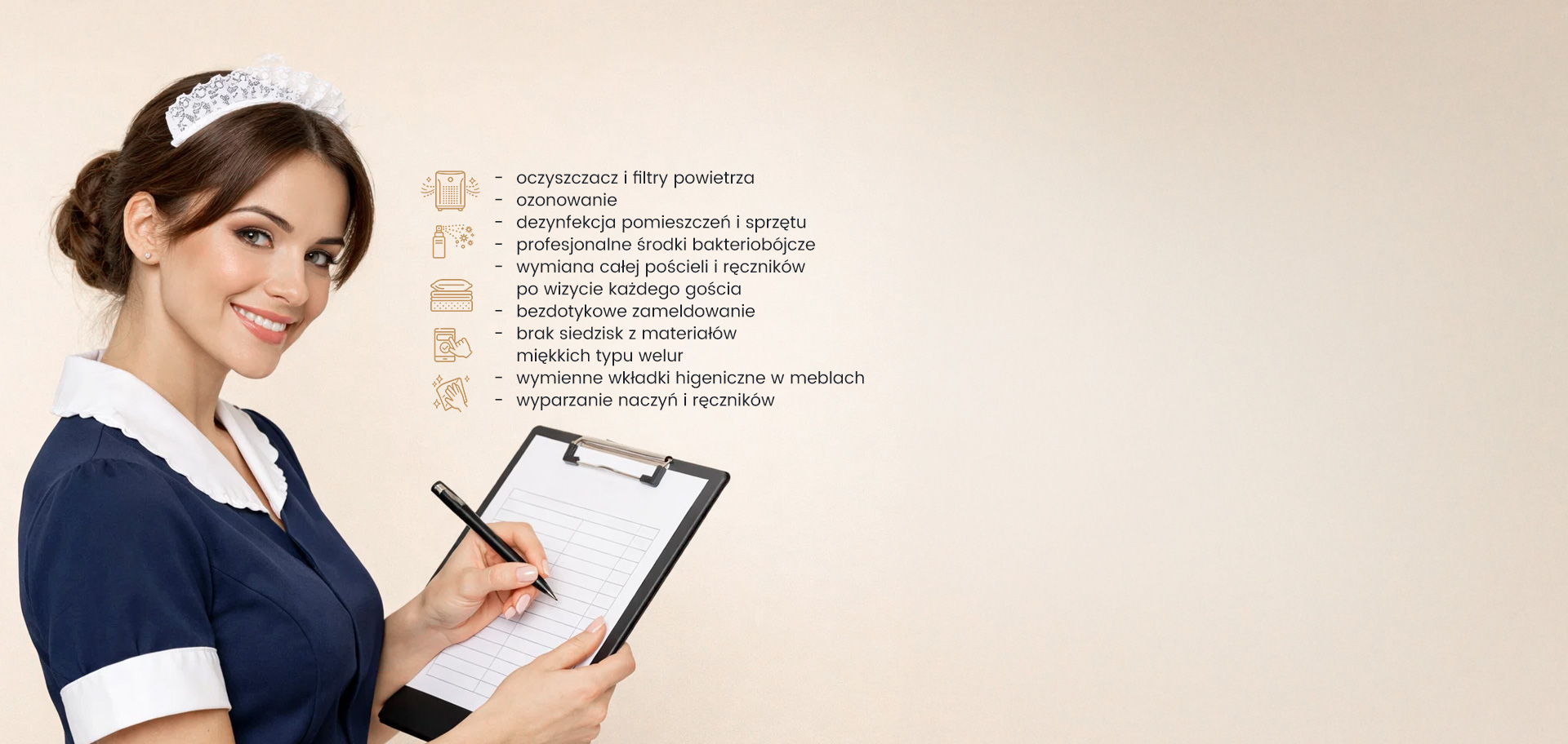 Wiemy, że każde zbliżenie daje niesamowitą frajdę, dlatego szczególnie dbamy o czystość i dezynfekcję w apartamencie używając profesjonalnych środków.